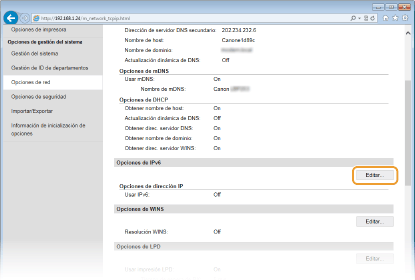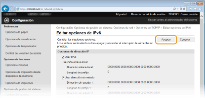 Las direcciones IPv6 del equipo pueden configurarse a través de la IU remota. Antes de configurar direcciones IPv6, compruebe las opciones de la dirección IPv4 (Visualización de las opciones de IPv4). Debe establecer las opciones de IPv4 correctas para poder utilizar direcciones IPv6. El equipo puede utilizar hasta nueve de las siguientes direcciones IPv6: