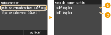 pulse <Half Duplex> o <Full Duplex>.![]() <Half Duplex>Envía y recibe datos de comunicación de forma alternativa. Seleccione cuándo se conecta el equipo a un dispositivo de red utilizando Half Duplex.