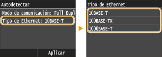 seleccione el tipo de Ethernet.![]() ![]() Si <Modo de comunicación> está establecido en <Half Duplex>, no puede seleccionar <1000BASE-T>.