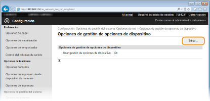 Uso del panel de controlTambién puede configurar las opciones de administración de opciones de dispositivos desde <Menú> en la pantalla Inicio. Activar/desactivar gestión de opciones de dispositivo