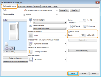 Pestaña [Configuración básica] Marque la casilla de verificación [Escala manual] Introduzca la escala de impresión en [Escala] [Aceptar]