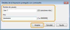 Introduzca el nombre de usuario en [Nombre de usuario] y el PIN en [PIN], y haga clic en [Aceptar].