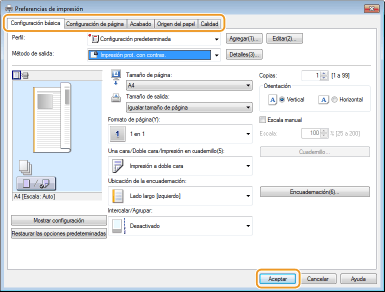 Haga clic en la pestaña [Configuración básica], [Configuración de página], [Acabado], [Origen del papel] o [Calidad] para especificar las opciones de impresión en cada pantalla según sea necesario.