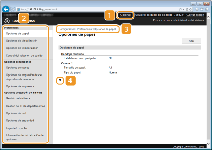 Muestra la página [Configuración]. Cuando haya iniciado sesión en el modo Administrador del Sistema, podrá cambiar los elementos de configuración y guardar/cargar los datos registrados. Configuración de las opciones de menú desde la IU remota
