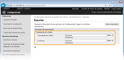 Introduzca una contraseña de cifrado con un máximo de 32 caracteres alfanuméricos. Introduzca la misma contraseña en [Confirmar]. Para exportar los datos, deberá establecer una contraseña de cifrado.