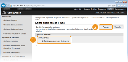 Uso del panel de controlTambién podrá activar o desactivar la comunicación IPSec desde <Menú> en la pantalla Inicio. Usar IPSec