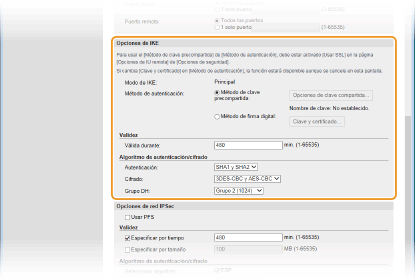 Especifique las opciones [Válida durante] y [Autenticación]/[Cifrado]/[Grupo DH].