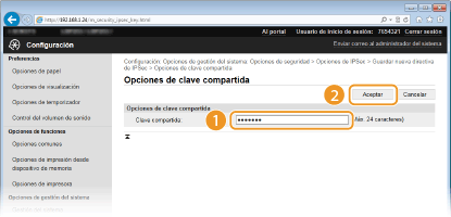 Introduzca hasta 24 caracteres alfanuméricos para la clave precompartida y haga clic en [Aceptar].