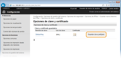 Haga clic en [Guardar clave prefijada] en la parte derecha del par de claves que desee utilizar.