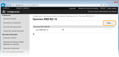 Uso del panel de controlTambién podrá activar o desactivar la autenticación IEEE 802.1X desde <Menú> en la pantalla Inicio. Opciones IEEE 802.1X