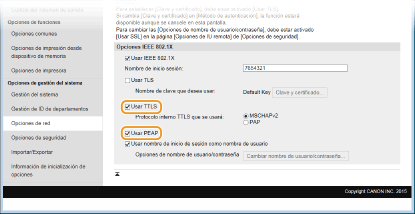 Seleccione la casilla de verificación [Usar TTLS] o [Usar PEAP].
