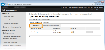 No se puede eliminar ningún par de claves si se está utilizando para algún fin, como cuando aparece "TLS" o "IEEE 802.1X" en [Uso de clave]. En este caso, deshabilite la función o sustituya el par de claves antes de eliminarlo.