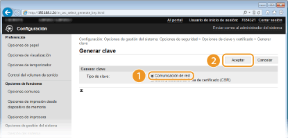Los pares de claves pueden generarse con el equipo en caso necesario para la comunicación cifrada a través de la Seguridad de capa de transporte (Transport Layer Security, TLS). Podrá utilizar TLS para acceder al equipo a través de la IU remota.Podrán registrarse hasta cinco pares de claves, incluidas las que están preinstaladas. Los certificados autofirmados se utilizan con pares de claves generados en la "Comunicación de red".Con una "Clave y solicitud de firma de certificado (CSR)", podrá solicitar un certificado digital emitido por la autoridad de certificación (CA) para el par de claves generado por el equipo.