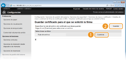Haga clic en [Examinar], especifique el archivo para la solicitud de firma del certificado y haga clic en [Guardar].