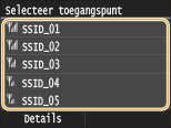 Tik op <Details> en selecteer een draadloze LAN-router. U kunt terugkeren naar het oorspronkelijke scherm door twee keer te tikken op <Sluiten> en vervolgens te drukken op