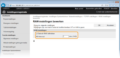 Schakel dit selectievakje in om af te drukken via RAW. Als u RAW niet gebruikt om af te drukken, schakelt u het selectievakje uit. [RX-time-out]