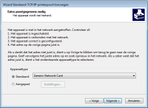 ![]() ![]() Als het volgende scherm verschijnt, volg dan de aanwijzingen op het scherm. ![]() * Als u het [Apparaattype] selecteert, selecteer dan [Canon Network Printing Device with P9100] (Canon netwerk afdrukapparaat met P9100) onder [Standaard].