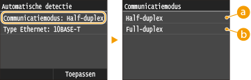 tik op <Half-duplex> of <Full-duplex>.![]() <Half-duplex>In deze modus worden er afwisselend gegevens verzonden en ontvangen. Selecteer deze modus als het apparaat is aangesloten op een netwerkapparaat dat half duplex gebruikt.