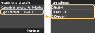 selecteer het type Ethernet.![]() ![]() Als <Communicatiemodus> is ingesteld op <Half-duplex>, kunt u <1000BASE-T> niet selecteren.