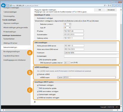 mDNS (multicast DNS) wordt ondersteund door Bonjour en is een protocol voor het koppelen van een hostnaam aan een IP-adres zonder DNS te gebruiken. Schakel dit selectievakje in om mDNS in te schakelen en voer de mDNS-naam in het vak [mDNS-naam]. [Instellingen DHCP-opties][Hostnaam verkrijgen]