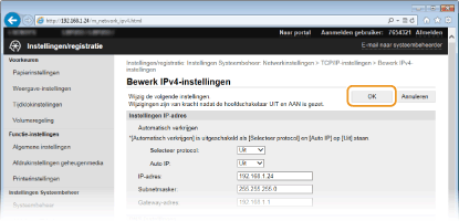 Instellingen selecteren vanaf het bedieningspaneelDe DNS-instellingen zijn ook bereikbaar via <Menu> op het scherm Start. IPv4-instellingen IPv6-instellingen