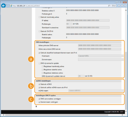 Schakel dit selectievakje in als u de DNS-records dynamisch wilt bijwerken, wanneer het IP-adres van het apparaat verandert. Als u één of meer adrestypen wilt opgeven die u wilt registreren op de DNS-server, schakelt u het selectievakje [Registreer handmatig adres], [Registreer stateful adres] of [Registreer stateless adres] in. Als u een interval wilt instellen tussen updates, typt u het aantal uren in het tekstvak [DNS dynamisch update-interval]. [mDNS-instellingen][Gebruik mDNS]