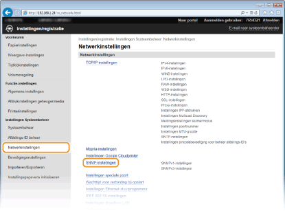 U kunt de SNMP-instellingen in- of uitschakelen vanuit <Menu> in het scherm Start. SNMP-instellingen