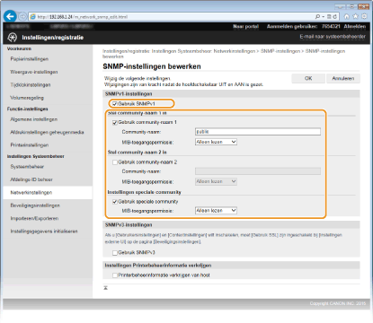 Als beide versies van SNMP zijn ingeschakeld, is het raadzaam de MIB-toegangsmachtigingen in SNMPv1 in te stellen op [Alleen lezen]. U kunt de toegangsmachtigingen voor MIB afzonderlijk instellen voor SNMPv1 en SNMPv3 (en voor elke gebruiker in SNMPv3). Als u [Lezen/schrijven] (volledige toegang) selecteert in SNMPv1, heeft dit gevolgen voor de beveiligingsfuncties van SNMPv3 omdat de meeste instellingen van het apparaat kunnen worden gewijzigd met SNMPv1.