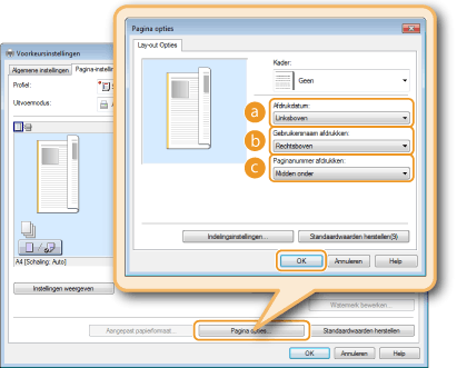 [Pagina-instelling] tabblad Klik op [Pagina opties] Selecteer de afdrukpositie van de afdrukdatum, de gebruikersnaam of het paginanummer [OK]  [OK]