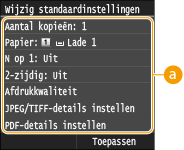 drukt. Als u deze standaardinstellingen afstemt op de bewerkingen die u regelmatig uitvoert, kunt u tijd besparen doordat u niet steeds dezelfde instellingen hoeft op te geven als u gaat afdrukken.