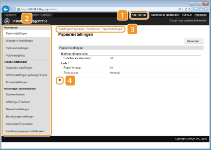 Geeft de pagina [Instellingen/registratie] weer. Wanneer u zich hebt aangemeld in de systeembeheerdersmodus, kunt u de instellingen van de opties wijzigen en de geregistreerde gegevens opslaan/laden. Menuopties instellen via de UI op afstand