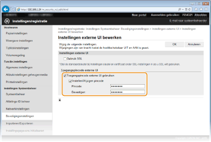 Schakel het selectievakje [Toegangspincode externe UI gebruiken] in en geef de pincode op.