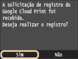Também pode registar a máquina a partir de um dispositivo móvel ou do Google Chrome. O visor da máquina apresenta o ecrã de confirmação seguinte antes de o registo ser completado. Prima <Sim> para concluir o registo.
