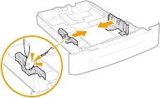 Pressione a alavanca de libertação e deslize a parte central da guia de papel na direção do lado da frente, ultrapassando a respetiva posição para papel A5.