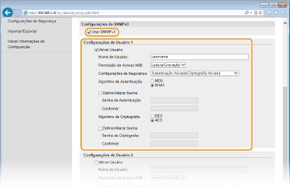 Se as duas versões de SNMP forem ativadas, é aconselhável definir a permissão de acesso MIB em SNMPv1 como [Somente Leitura]. A permissão de acesso MIB pode ser definida separadamente em SNMPv1 e SNMPv3 (e para cada utilizador em SNMPv3). Selecionar [Leitura/Gravação] em SNMPv1 neutraliza as funções de segurança robustas que caracterizam o SNMPv3, uma vez que a maior parte das definições da máquina passa a poder ser controlada com SNMPv1.