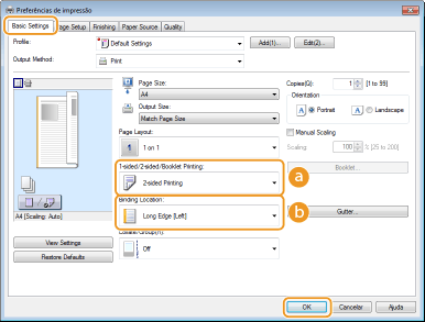 Selecionar [1-sided Printing] (Impressão em 1 Lado) ou [2-sided Printing] (Impressão em 2 Lados) em [1-sided/2-sided/Booklet Printing] (1 Lado/2 Lados/Impressão de Brochura)