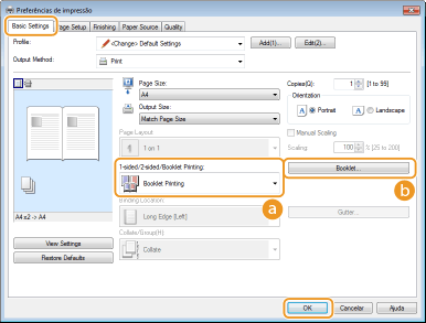 Selecione [Booklet Printing] (Impressão de Brochura) em [1-sided/2-sided/Booklet Printing] (1 Lado/2 Lados/Impressão de Brochura)