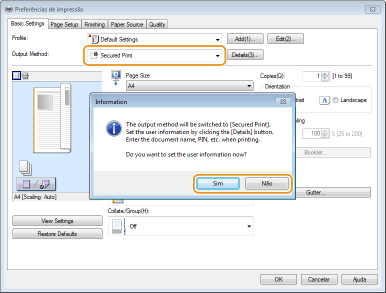Selecione [Secured Print] (Impressão Protegida) em [Output Method] (Método de Saída).