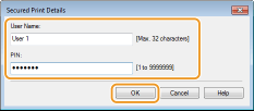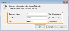 Introduza a [Document Name] (Nome do documento), [User Name] (Nome de Utilizador) e [PIN] e clique em [OK].