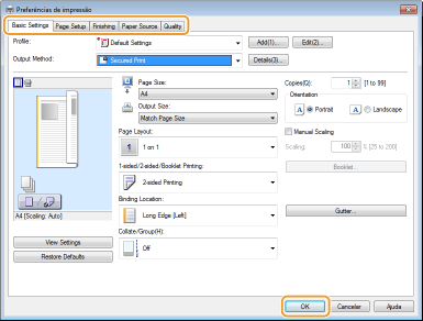 Clique nos sepradores [Basic Settings] (Definições Básicas), [Page Setup] (Configurar Página), [Finishing] (Finalização), [Paper Source] (Origem do Papel), ou [Quality] (Qualidade) para especificar as definições de impressão em cada ecrã conforme necessário.