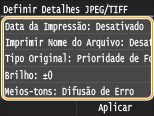 Especifique as predefinições da função de impressão USB para ficheiros JPEG e TIFF.