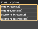 Se selecionar <Data/Hora (Crescente)> ou <Data/Hora (Decrescente)>, os ficheiros são ordenados com base nas datas e nas horas de modificação dos ficheiros.