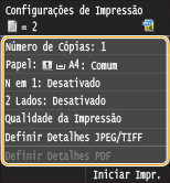 Pode imprimir duas ou quatro imagens numa só folha. Selecione <2 em 1> ou <4 em 1>. <N em 1> não está disponível para a impressão de ficheiros TIFF.