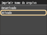 Se tocar em <Ativado>, pode imprimir o nome do ficheiro por baixo de cada imagem.