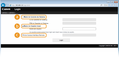 Pode efetuar todas as operações e definições da UI Remota. Introduza a ID adequada em [ID do Gerente do Sistema] e o PIN em [PIN do Gerente do Sistema] (