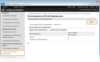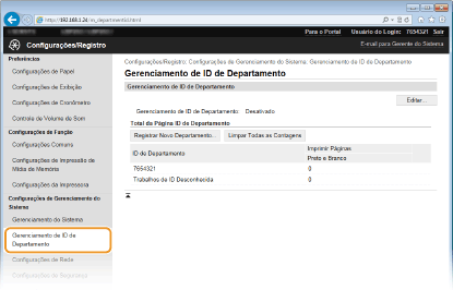 Se pretender repor as contagens a zero, clique na ligação de texto correspondente por baixo de [ID de Departamento] e clique em [Limpar Contagem]