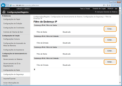 Se os endereços IP não forem introduzidos corretamente, poderá não conseguir aceder à máquina a partir da UI Remota; nesse caso, será necessário definir <Filtro de Endereço IPv4> ou <Filtro de Endereço IPv6> como <Desativado>. Filtro de Endereço IPv4 Filtro de Endereço IPv6