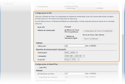 Especifique as definições [Válido para] e [Autenticação]/[Criptografia]/[Grupo DH].