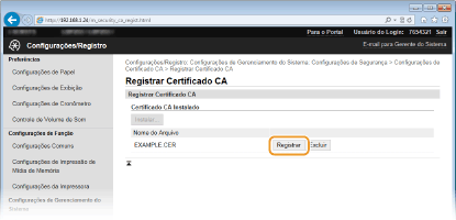 Clique em [Registrar Chave e Certificado] ou [Registrar Certificado CA].