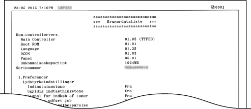 <Brugerdataliste> omfatter ikke indstillingslisten for <Netværksindstillinger> og <Indstil. for systemadmin.>. Kontroller alle indstillingspunkterne, herunder <Netværksindstillinger> og <Indstillinger for systemadministration>, ved at udskrive <Systemadministratordataliste>.